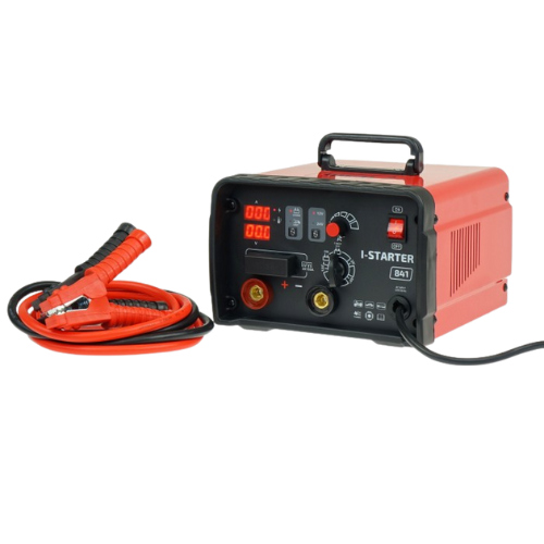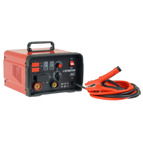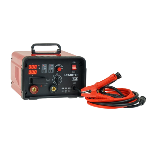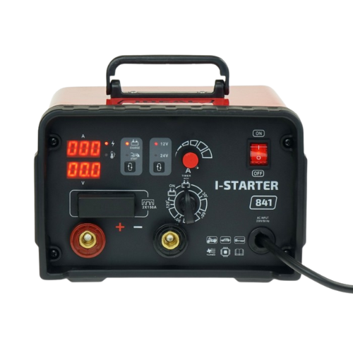 Inwertorowy prostownik INVER STARTER 841 12/24V z funkcją rozruchu. Bezstopniowa regulacja prądu, cyfrowe mierniki prądu i napięcia, prąd rozruchu 800A. Idealny do samochodów osobowych, vanów i lekkich ciężarówek.