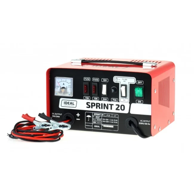 Prostownik transformatorowy SPRINT 20 do akumulatorów 12V i 24V. Dwa tryby ładowania, analogowy miernik i pełne zabezpieczenia dla bezpiecznej pracy.
