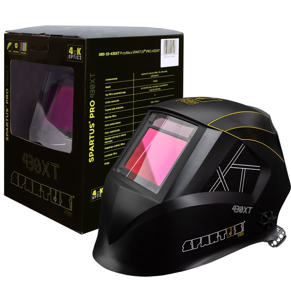 SPARTUS® Pro 430XT to automatyczna przyłbica spawalnicza z filtrem klasy 1/1/1/1, dużym polem widzenia 100 × 73 mm, technologią True Color i funkcją szlifowania GRIND, zapewniająca komfort, precyzję i pełną ochronę oczu oraz twarzy podczas spawania metodami MIG/MAG, TIG, MMA.