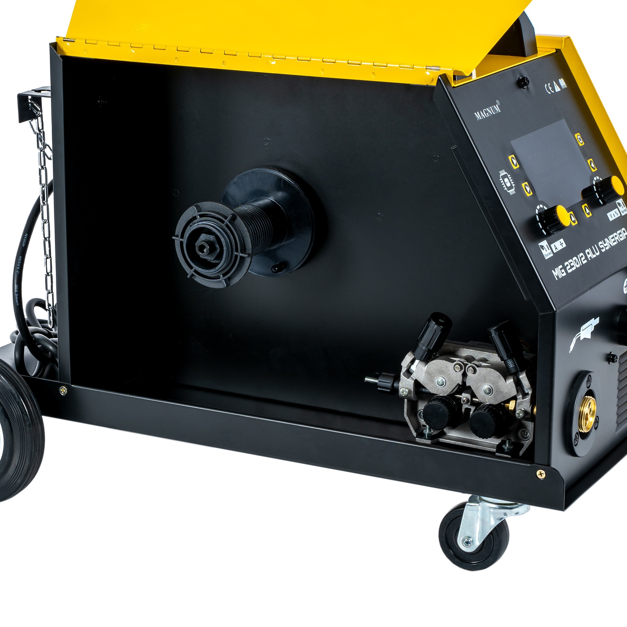 Spawarka Magnum MIG 230/2 ALU SYNERGIA to profesjonalny półautomat 230/400V z mocą do 230A, przeznaczony do spawania MIG/MAG, MMA i TIG Lift, idealny do stali, stali nierdzewnej oraz aluminium. Wyposażony w tryb synergiczny, 21 kanałów pamięci, cztero-rolkowy podajnik 4×4 oraz czytelny wyświetlacz LED. Doskonały wybór do przemysłu, warsztatów i produkcji.