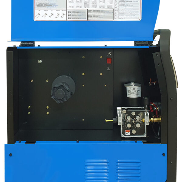 Spawarka umożliwia pracę w kilku trybach, w tym spawanie punktowe, oraz oferuje pamięć ostatniego ustawienia po wyłączeniu urządzenia. Dodatkowo możliwe jest zapisanie 35 programów spawania, co znacząco przyspiesza pracę przy powtarzalnych zadaniach. Wewnątrz pokrywy komory szpuli umieszczono praktyczny poradnik spawacza, ułatwiający bieżącą obsługę i dostęp do parametrów.