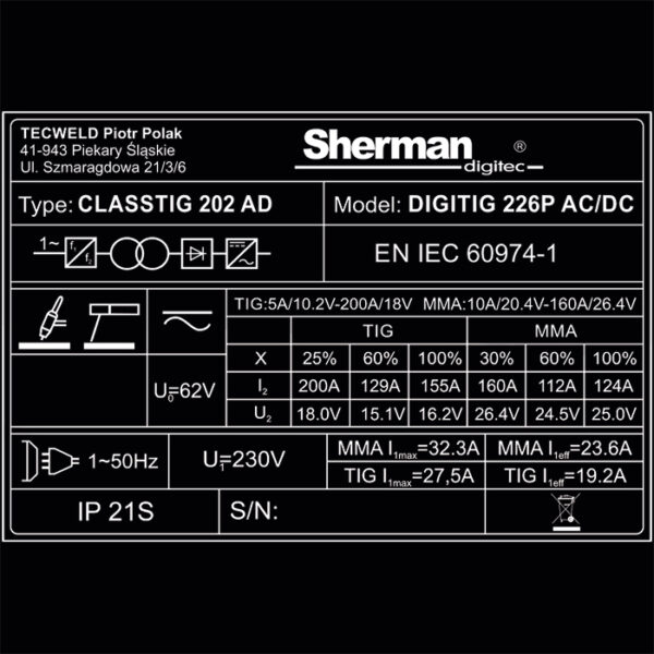 - Sherman digitec 206P AC/DC – w modelu wykorzystano technologię PWM oraz IGBT, co poprawia wydajność pracy oraz ogranicza pobór energii elektrycznej; dodatkowo urządzenie wyposażone zostało w funkcje: Arc Force czy regulacji parametrów pulsu,