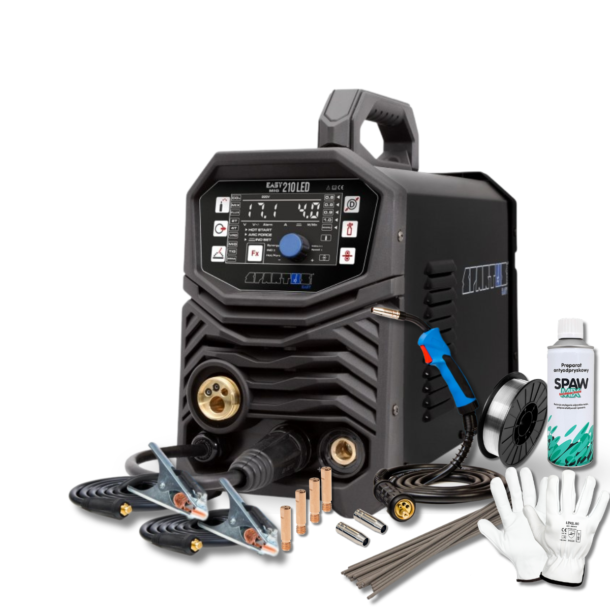 SPARTUS® EasyMIG 210LED dostępny jest w dedykowanym pakiecie. Oprócz źródła pakiet zawiera komplet przewodów MMA, wężyk gazowy oraz uchwyt spawalniczy EasyMIG 150. Tak skomponowany zestaw sprawia, że urządzenie EasyMIG 210LED jest w pełni gotowe do pracy.