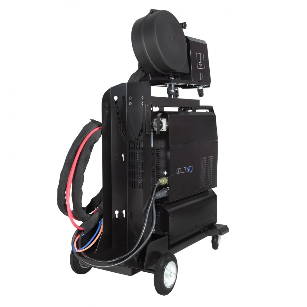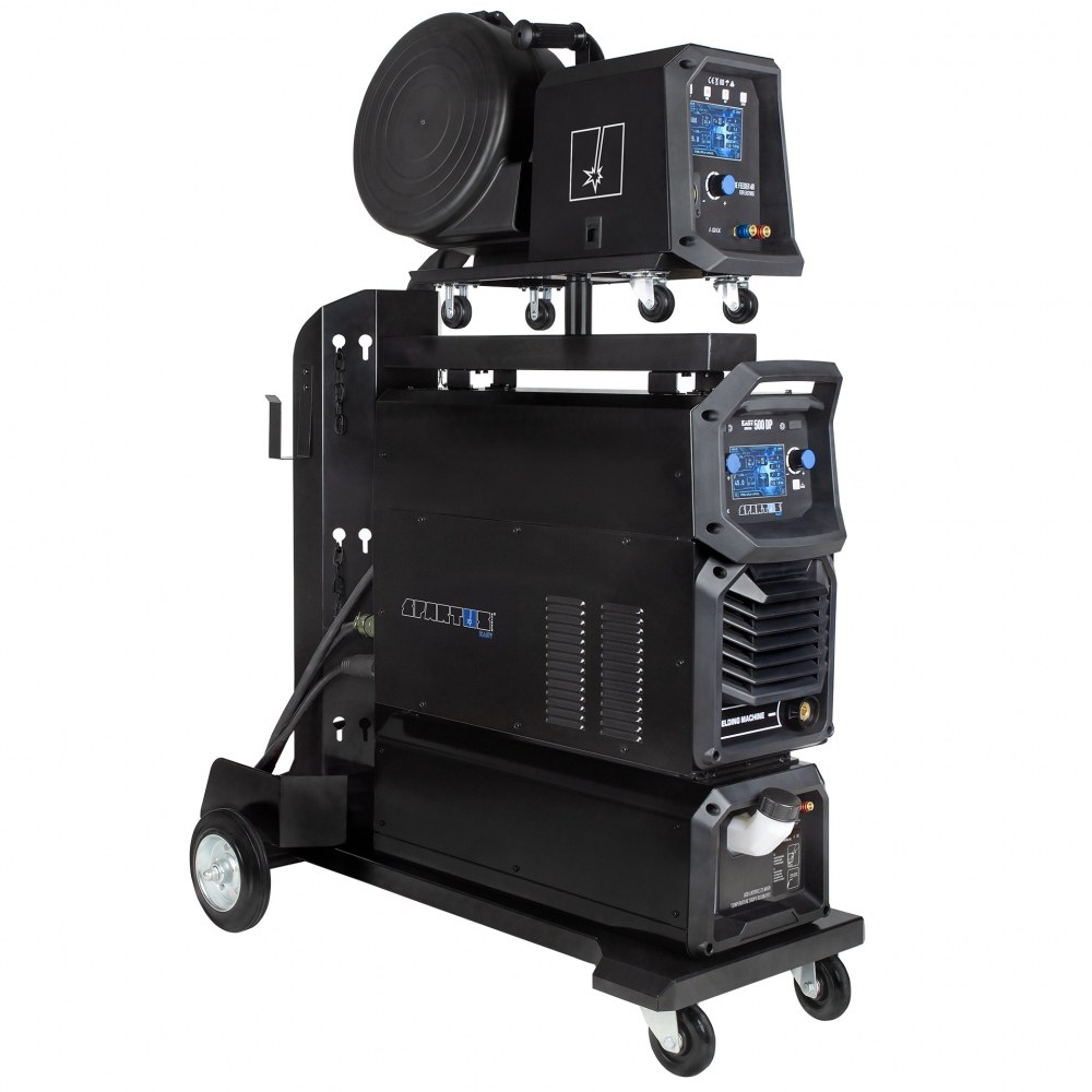 Całość umieszczona jest na stabilnym wózku spawalniczym z uchwytem na butlę gazową, co gwarantuje mobilność i wygodę w przemieszczaniu się po warsztacie lub hali produkcyjnej.