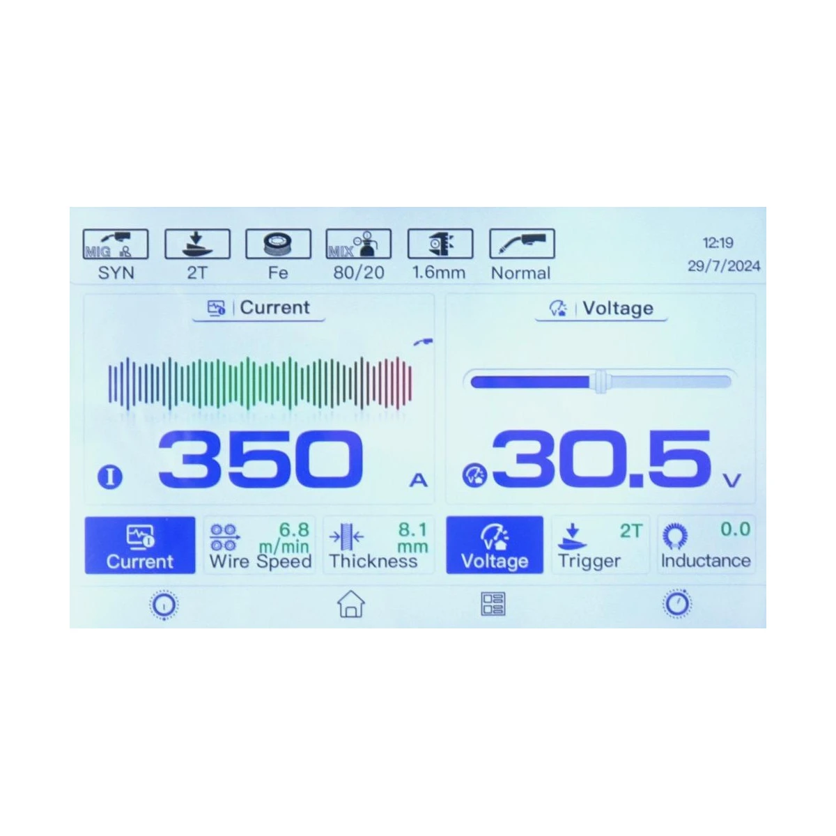 Szybka regulacja synergiczna parametrów spawania poprzez 7-calowy, dotykowy wyświetlacz LCD, czyni urządzenie bardzo łatwym w użyciu. Wystarczy ustawić grubość i rodzaj spawanego materiału i zacząć spawać: inteligentny i automatyczny układ kontroli łuku spawalniczego, krok po kroku, dobierze najlepsze parametry, dla każdej pozycji spawania i dla każdego materiału. Użytkownik może również ustawić ręcznie długość łuku spawalniczego i dopasować wygląd spoiny do własnych potrzeb. Przy metodzie MIG/MAG mamy możliwość wyboru trybu przycisku w uchwycie, pomiędzy pracą w trybie SPOT (spawanie punktowe), 2-takt (bez blokady), 4-takt (blokada przycisku do długich spoin),S2-takt oraz S4-takt.