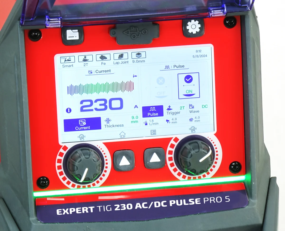 Czytelny ekran LCD umożliwia łatwą regulację prądu, pulsu, balansu AC, częstotliwości, gazu osłonowego oraz funkcji Hot Start i Arc Force.