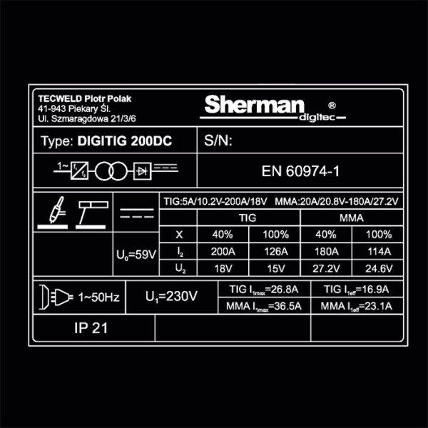 | Prąd spawania TIG | 200 A |