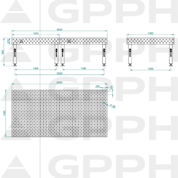 Blaty stołów GPPH — dostępne m.in. w systemach fi28 i fi16 — wyposażone są w frezowane i fazowane otwory, które gwarantują szybki, powtarzalny montaż narzędzi bez nadmiernego zużycia. Gęste ożebrowanie pod blatem zapewnia odporność na odkształcenia oraz zachowanie idealnej płaskości, a grawerowana siatka 100×100 mm ułatwia precyzyjne ustawianie elementów i kontrolę wymiarów konstrukcji.