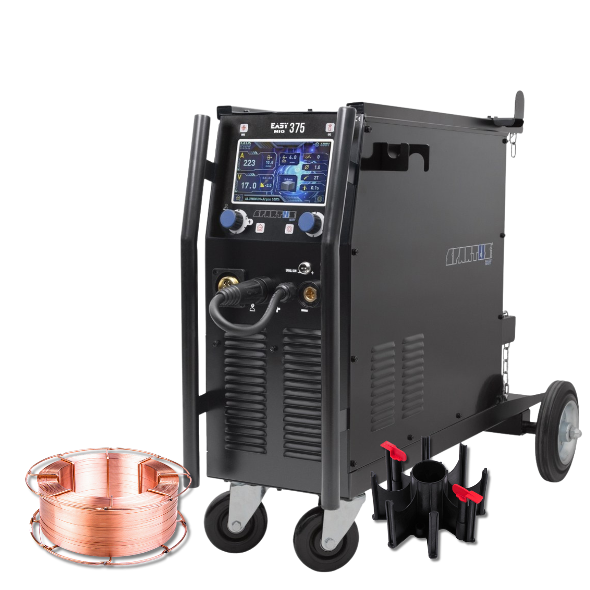 SPARTUS® EasyMIG 375 to nowoczesny, inwertorowy półautomat spawalniczy oparty na tranzystorach IGBT, zaprojektowany dla profesjonalistów. Urządzenie umożliwia spawanie metodami MIG/MAG w osłonie gazów obojętnych i aktywnych, MMA (elektrodą otuloną) oraz TIG Lift. Dodatkowo, dzięki możliwości zmiany biegunowości, spawarka pozwala na spawanie drutem samoosłonowym bez gazu.